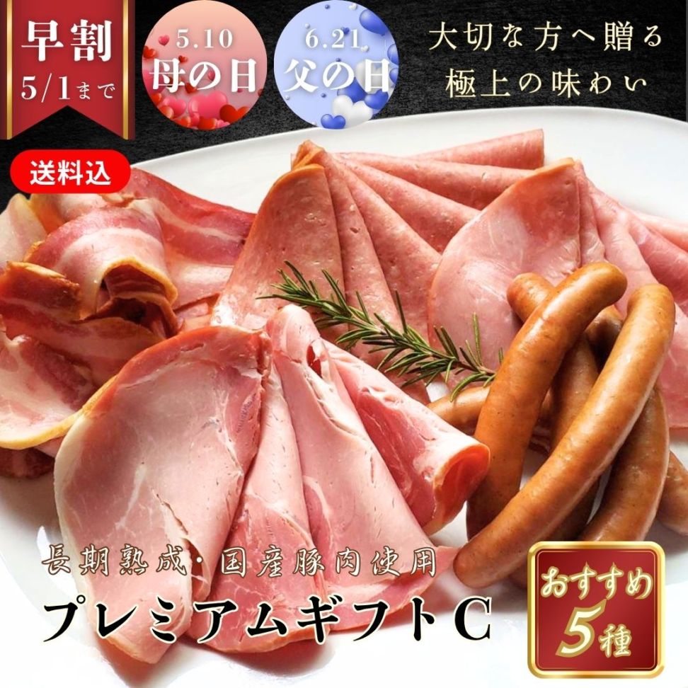 早割10%OFF【送料込】プレミアムギフト[C]おすすめ5種セット/保存料・化学調味料・結着剤・増量剤無添加/ドイツ製法/ボンレスハム・プレスハム・ベーコン・ボロニア・ウインナ―