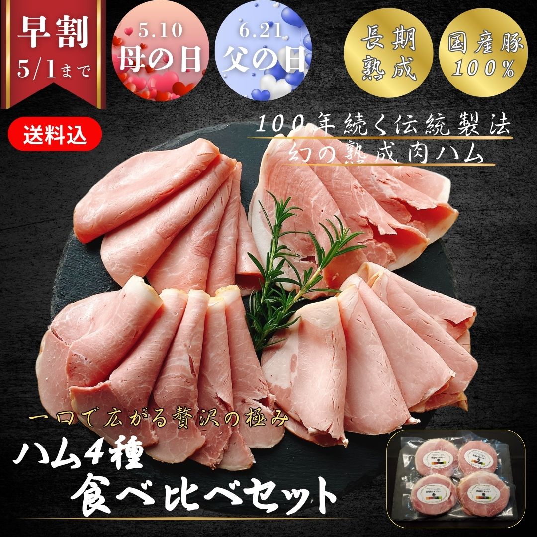 早割10%OFF【送料込】ハム4種食べ比べセット/保存料・化学調味料・結着剤・増量剤無添加/ドイツ製法/ボンレス・ロース・もも・プレス