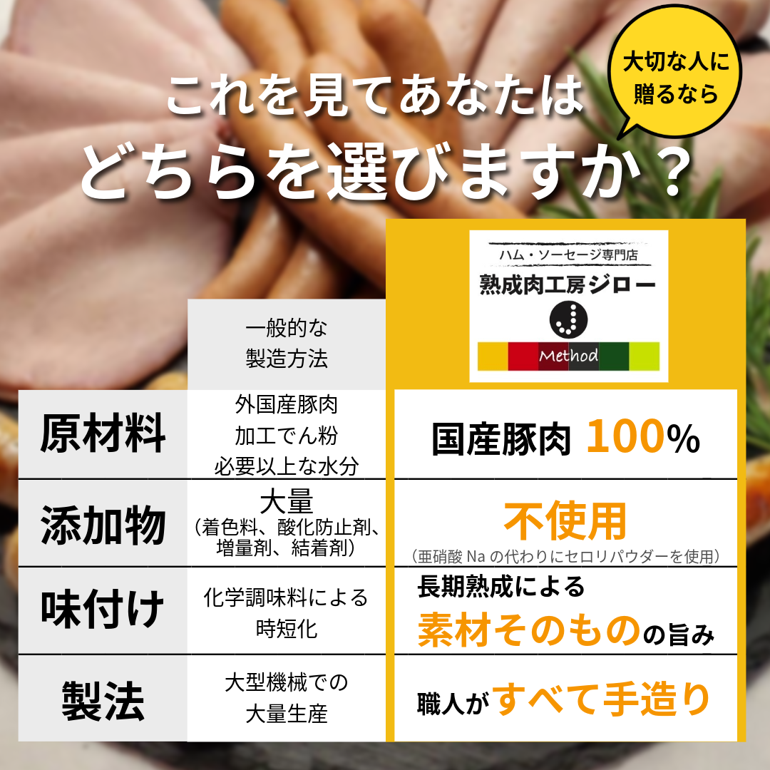 1~2日で終わらせてしまう添加物に頼る一般製法と違い、ジローのハム造りでは余計な添加物には頼らない。昔ながらの多くの時間を費やした手造りの長期熟成によって自然なうまみが3倍になる。