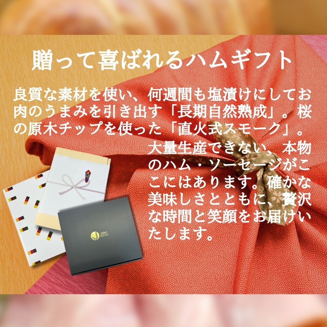 1~2日で終わらせてしまう添加物に頼る一般製法と違い、ジローのハム造りでは余計な添加物には頼らない。昔ながらの多くの時間を費やした手造りの長期熟成によって自然なうまみが3倍になる。