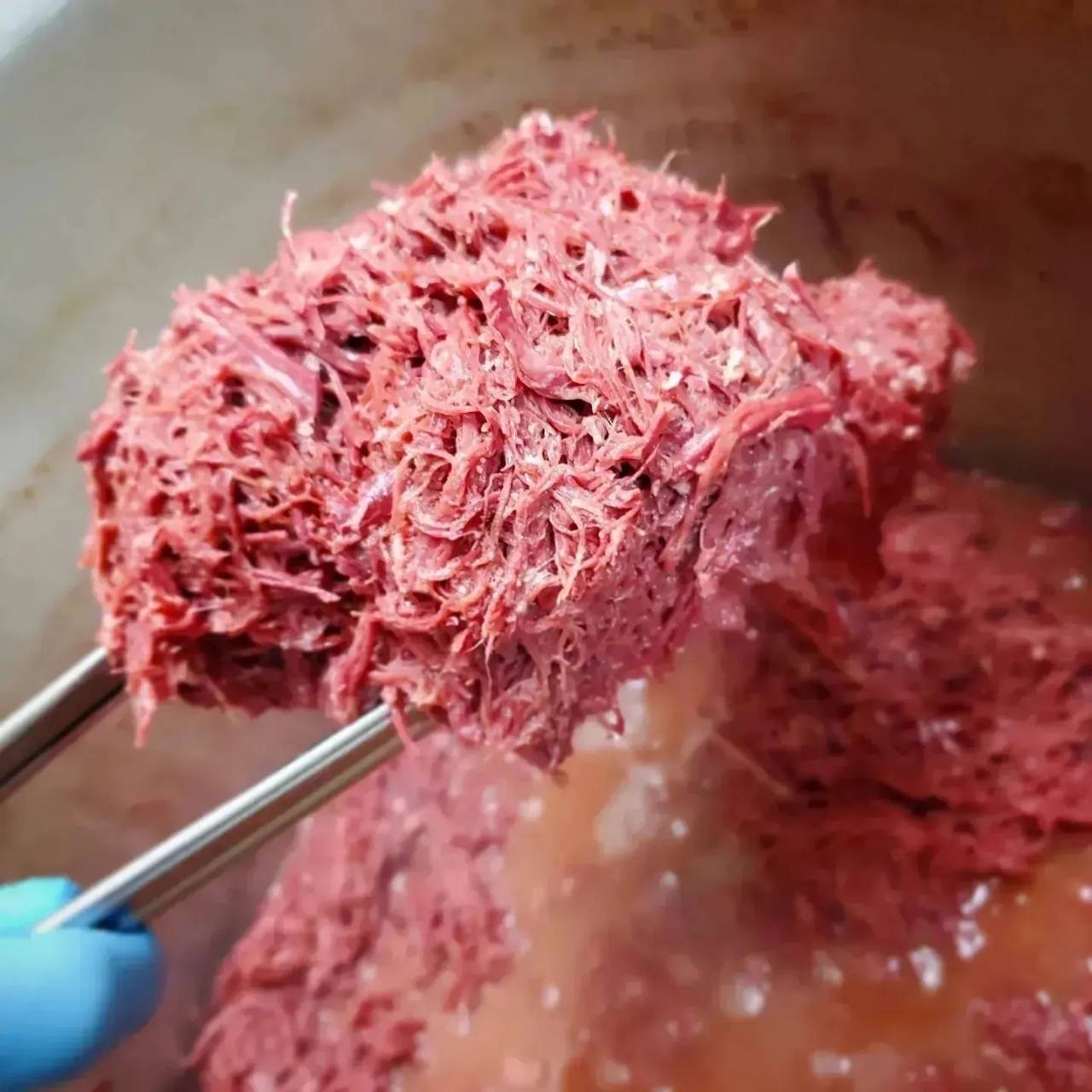 2日間じっくり煮込んだ牛肉を、熱々のうちにほぐししながら余分な脂や筋を丁寧に取り除きました。
