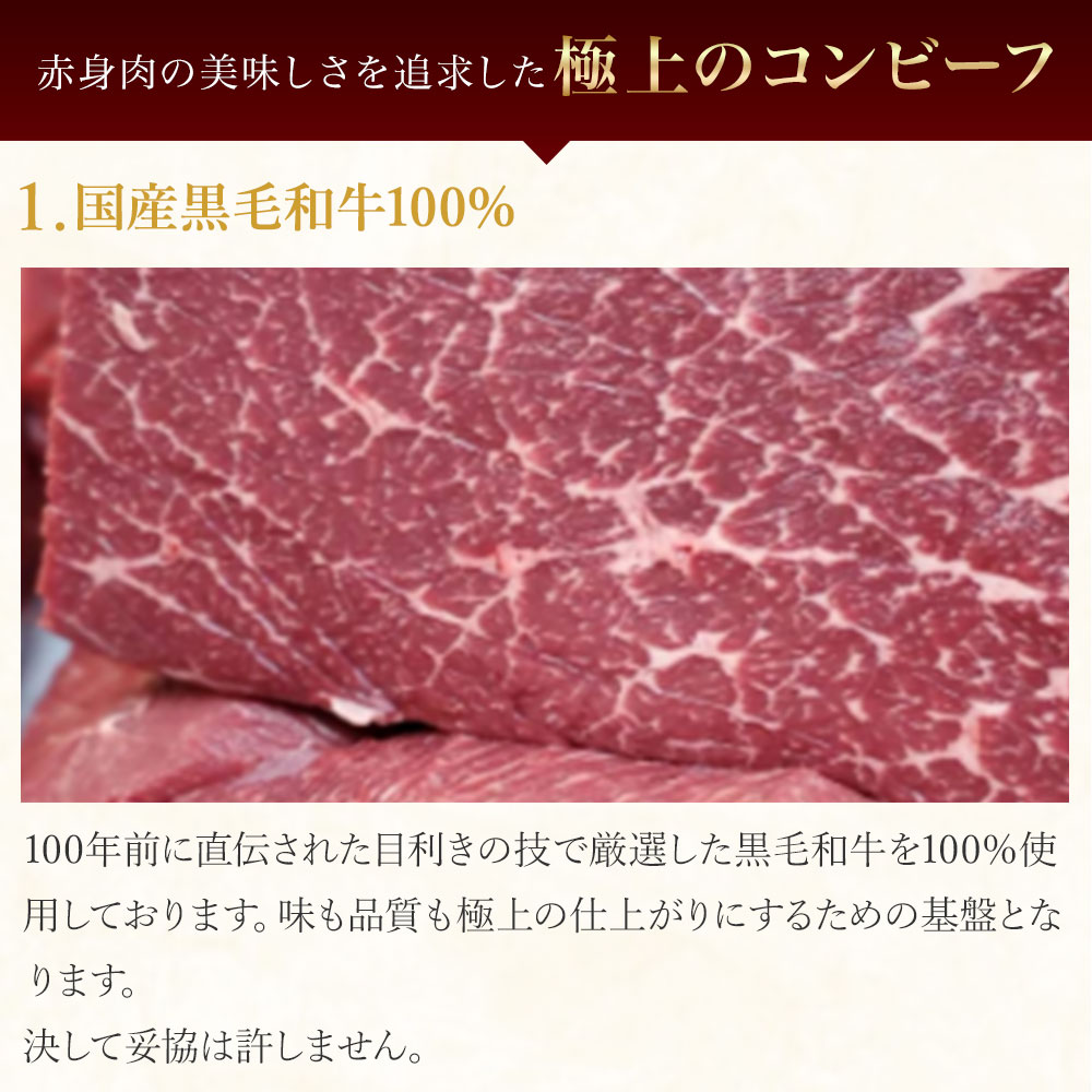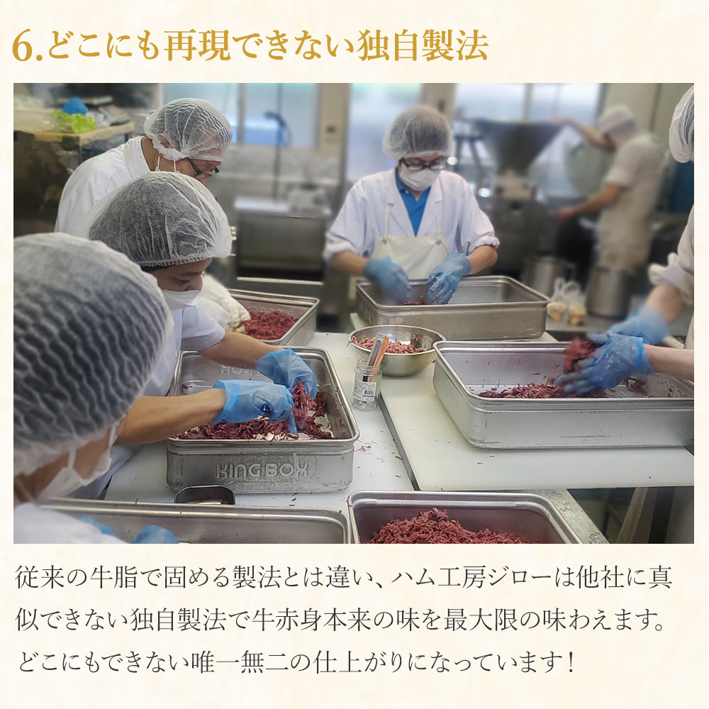 従来の牛脂で固める製法とは違い、ハム工房ジローは他社に真似できない独自製法で牛赤身本来の味を最大限の味わえます。