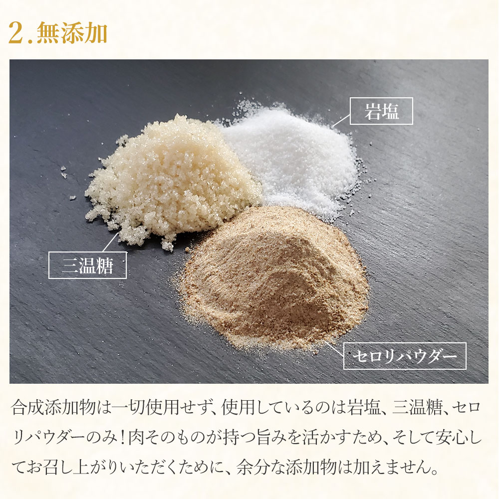 合成添加物は一切使用せず、使用しているのは岩塩、三温糖、セロリパウダーのみ!肉そのものが持つ旨みを活かすため、そして安心してお召し上がりいただくために、余分な添加物は加えません。