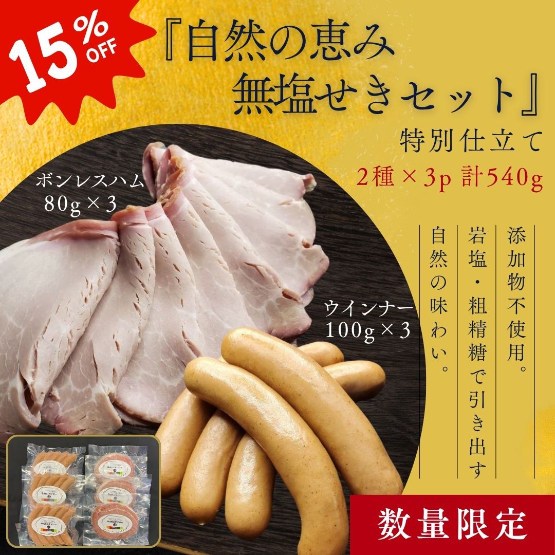 数量限定【送料込】自然の恵み無塩せきセット/オンラインショップ限定/保存料・化学調味料・結着剤・増量剤・発色剤無添加/ドイツ製法/ボンレスハム240g・ウインナ―300g